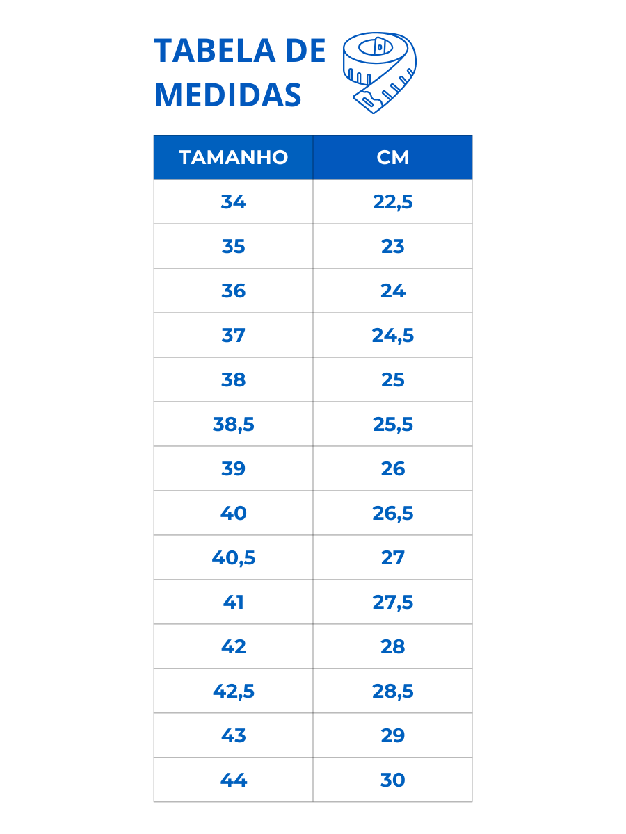 O tamanho deve ser consultado na tabela de medidas acima. O cliente deve medir o seu pé e escolher o seu tamanho de acordo com a medida.